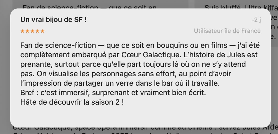 Seb est en écriture de son prochain podcast immersif, Cœur Galactique sera un Space Opéra. Il sera publié au printemps 2025 ...